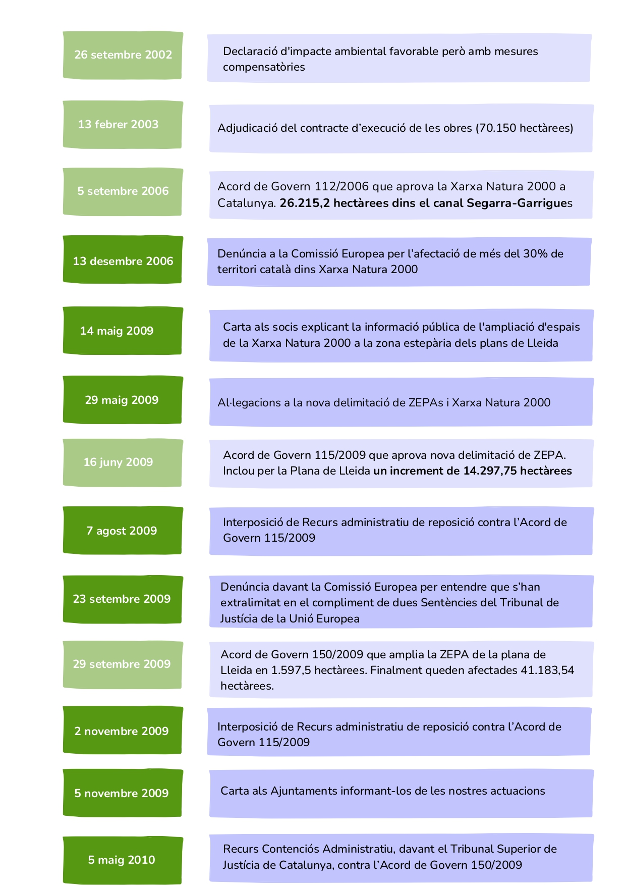 Per a fer memòria de tot plegat, i per a que mai se’ns pugui titllar d’impassibles o d’indiferents, hem cregut oportú fer un breu recordatori de totes les actuacions que hem fet. Evidentment, per a evitar l’abocament de massa informació, hem triat el més important de més de vint anys d’actuacions. I ho farem en forma de cronograma per a ser més didàctics.